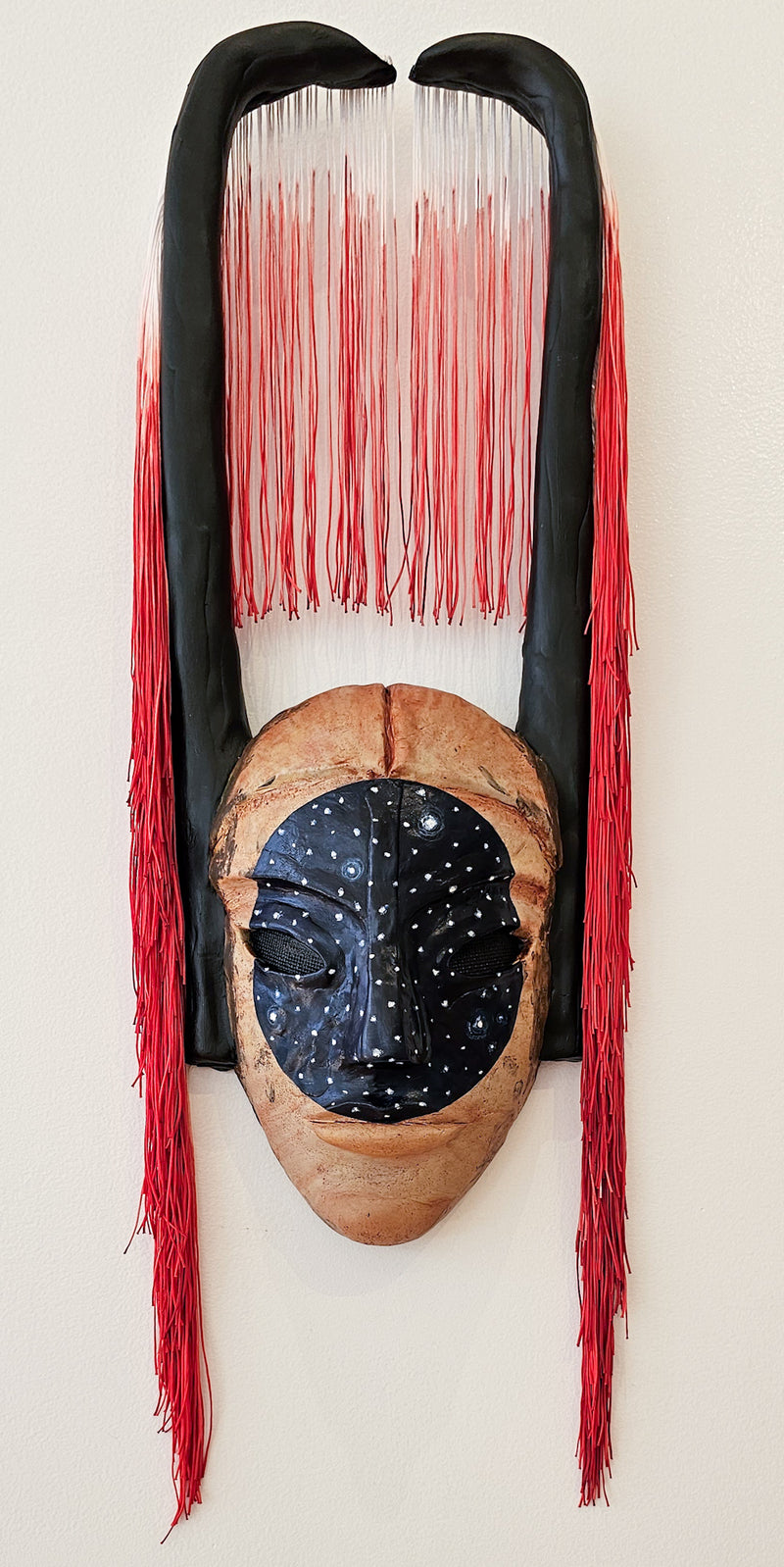 10" x 36" x 5" | Clay, metal mesh, fabric fringe, driftwood, acrylic paint | 2025